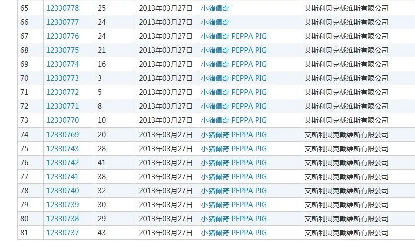 虽然2015年才进入中国市场,但是小猪佩奇的商标在2013年就已经提交,进行了近乎全类别的注册,商标保护很是到位。毫不夸张的说,现在“小猪佩奇”四个字已经是一字千金。
